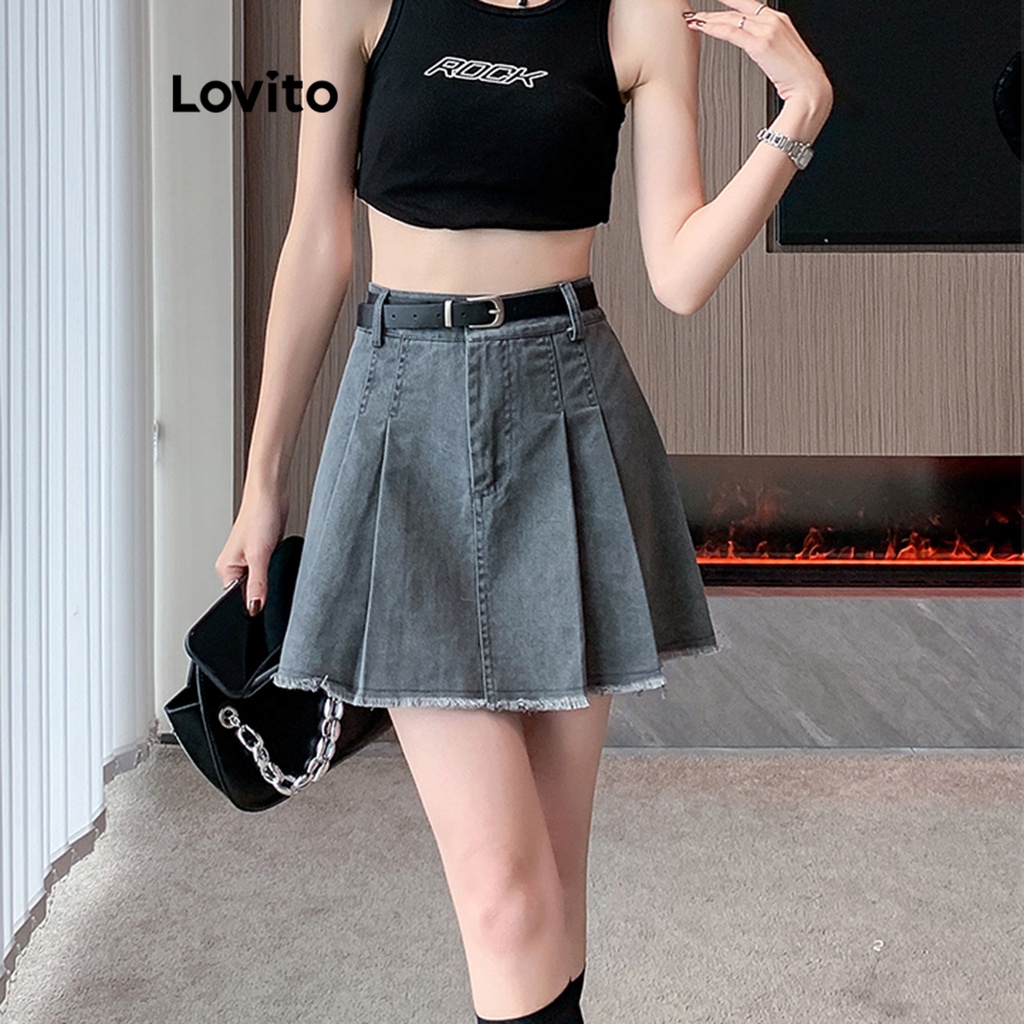 Lovito Shorts Saia Jeans com Divisão, Zíper e Botão para Mulheres LNE13106 (Azul)