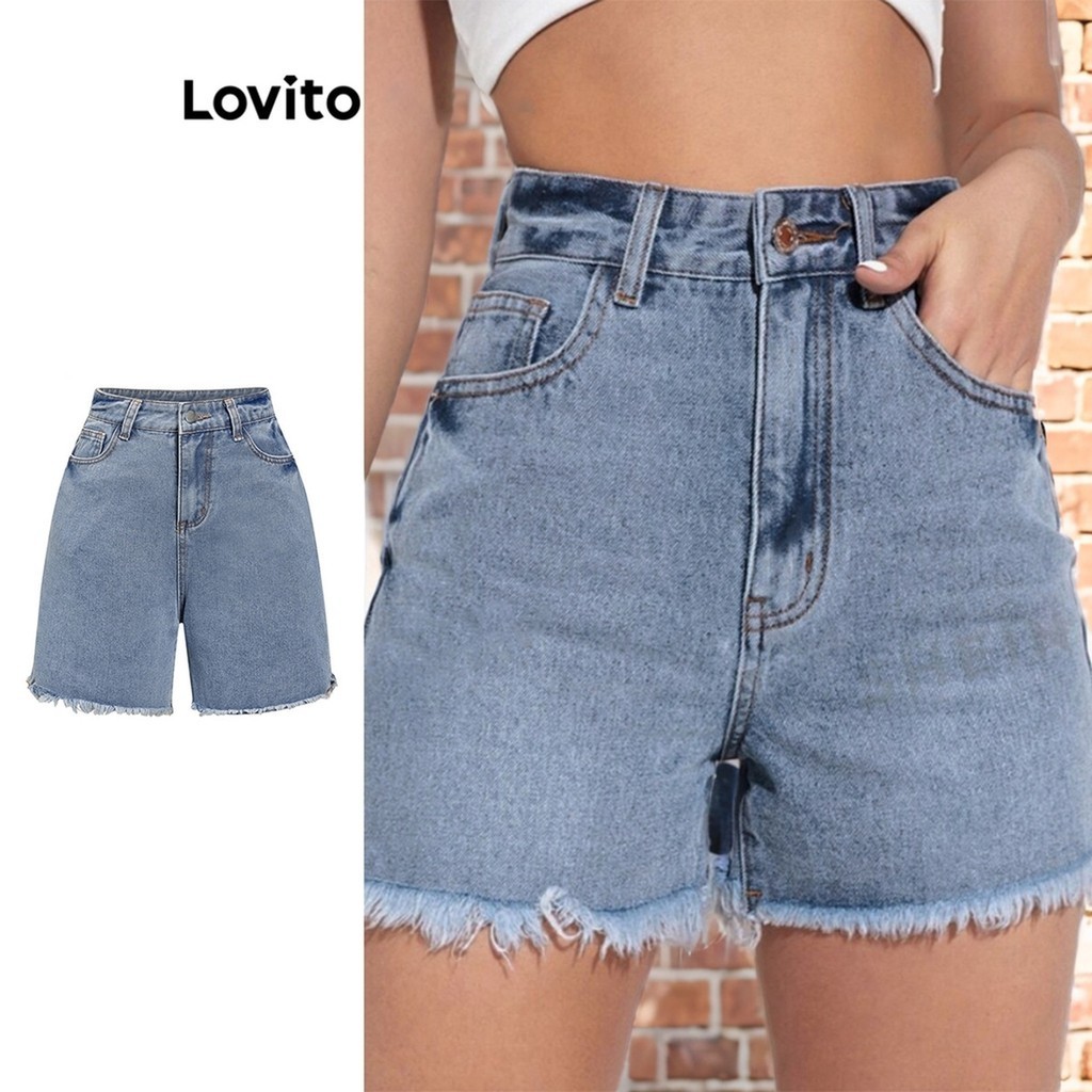 Lovito Shorts jeans casuais com botão liso e bainha crua para mulheres L87ED296
