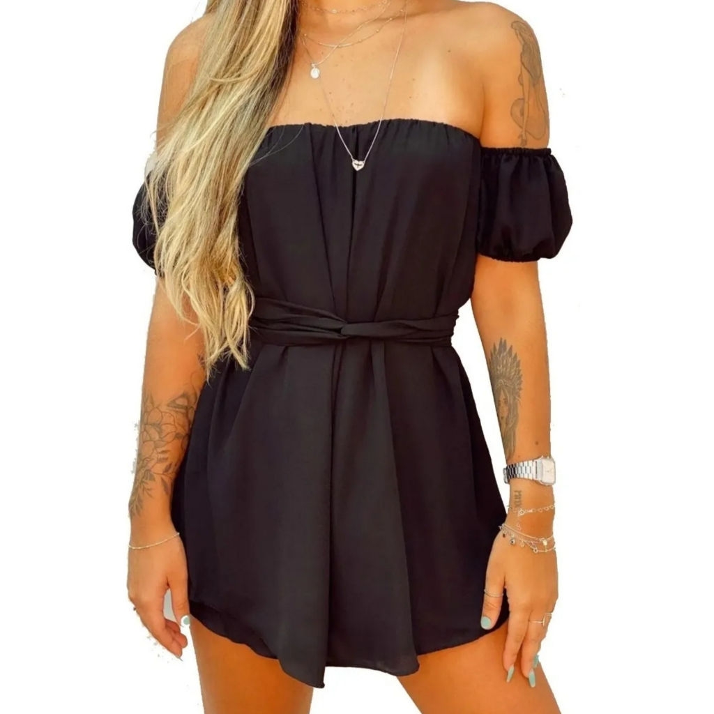 Macaquinho Feminino Ciganinha Curto Soltinho Com Vestido Rodado E Shortinho Vem Com Cinto Faixa Para Amarrar Tem Elástico Nas Mangas nas Circunferências dos Seios Bojo Ombro a Ombro Blogueira