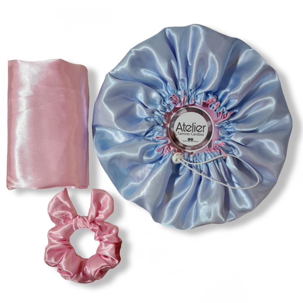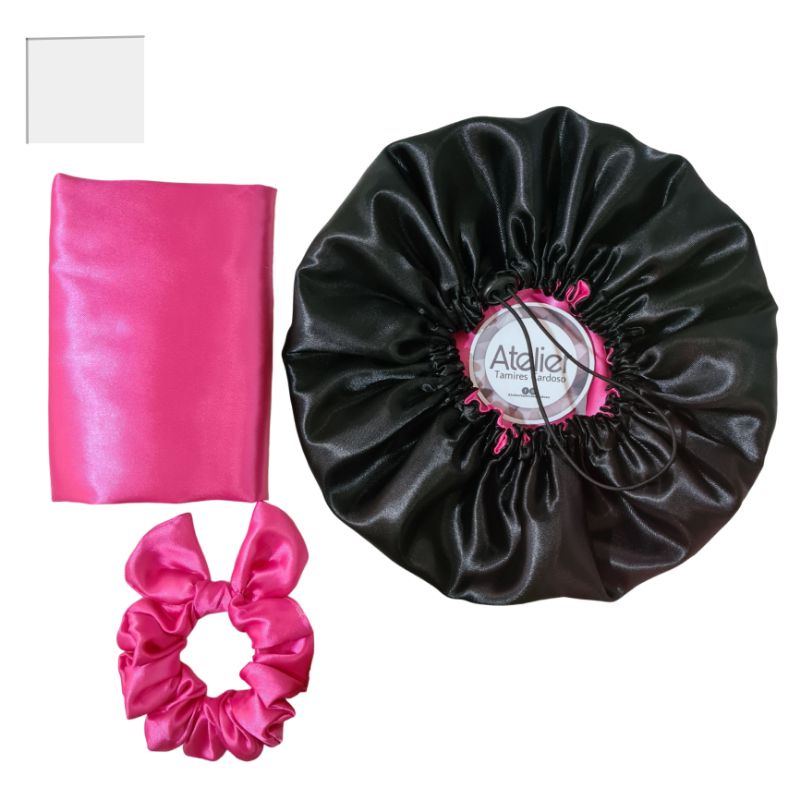 Touca Cetim dupla face + fronha cetim + lacinha kit completo anti frizz