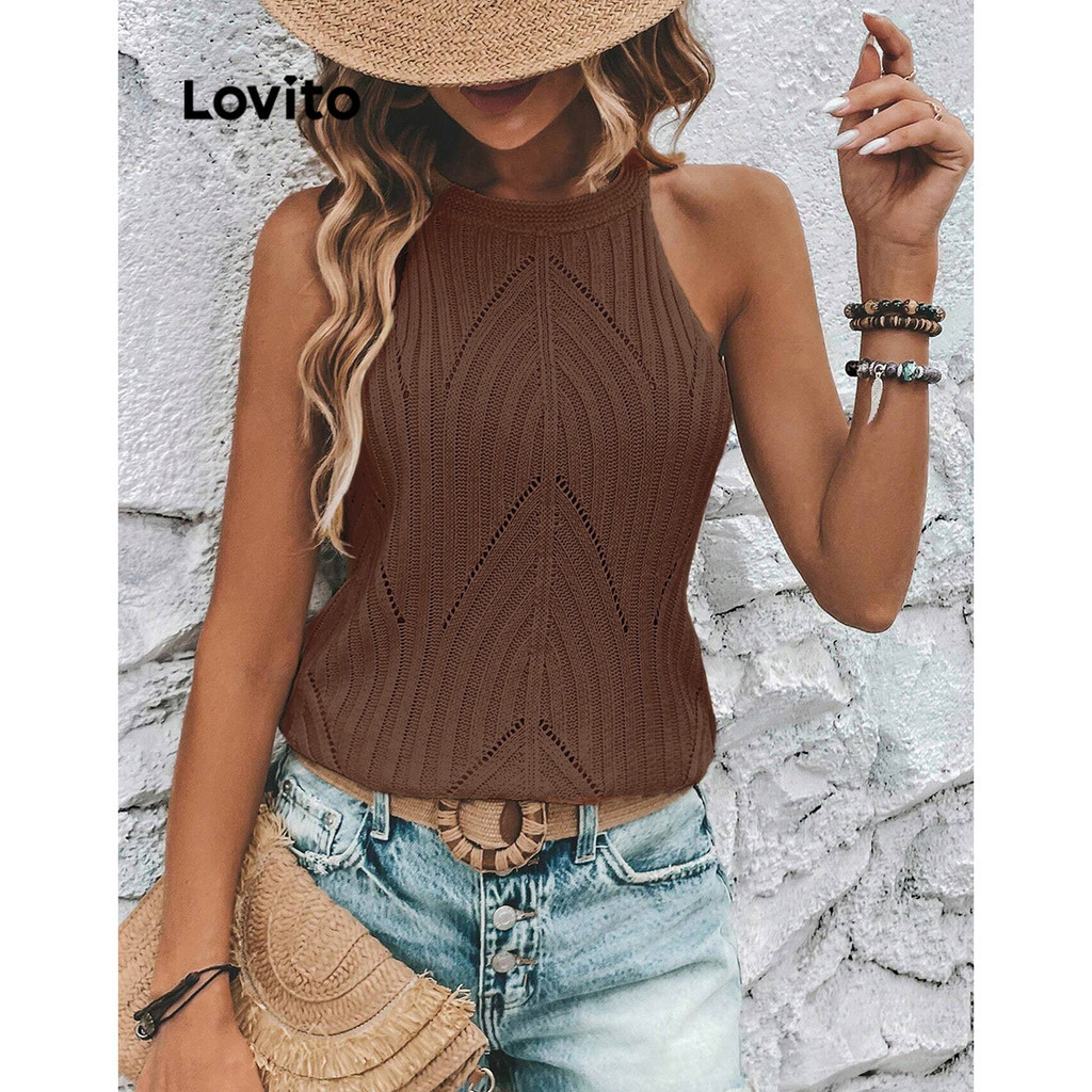 Lovito Top de malha vintage liso com ilhós nas costas para mulheres LBL20266