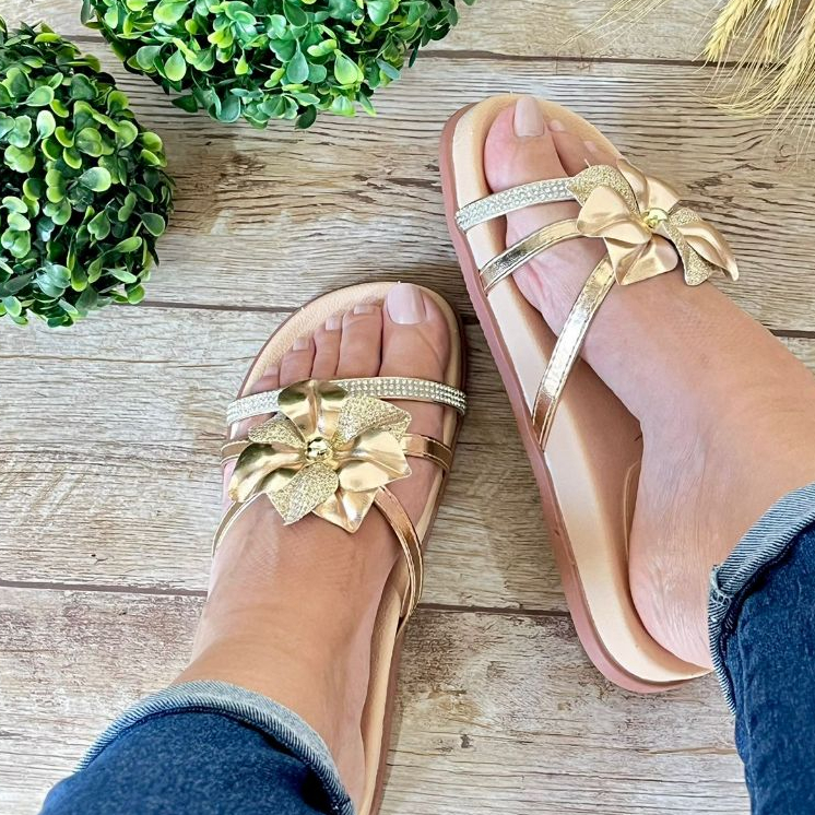Sandália Papete Feminina Brilho Rasteira Femenina Strass Com Flor Rasteirinha Casual Moda Luxo Birken FlatForm Confortável Lançamento