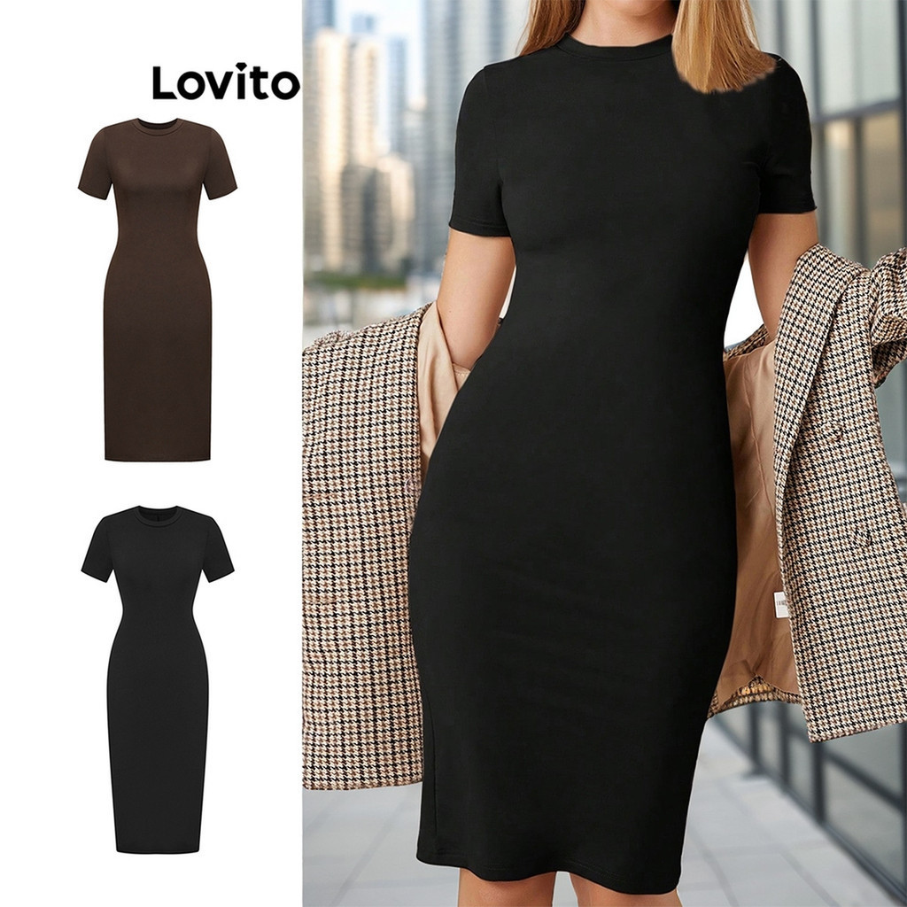 Lovito Casual Vestido Feminino Liso Básico com Fenda Traseira L68ED300 (Preto)