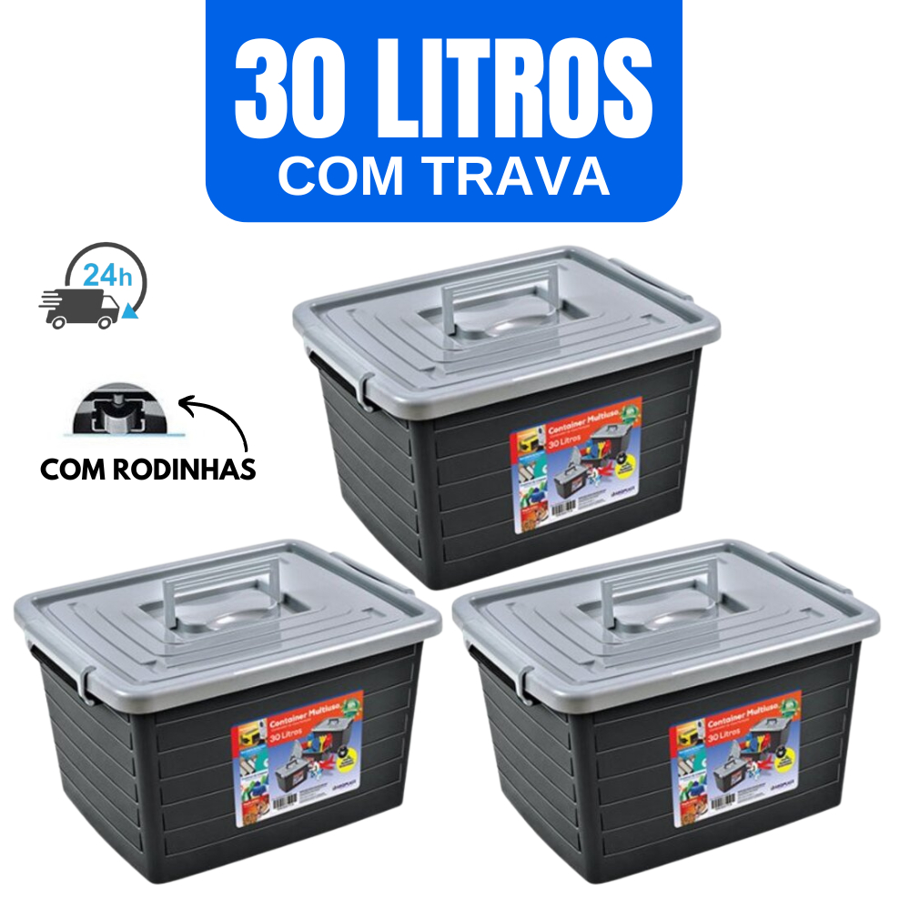 3 Caixas Organizadora Container Preta Com Tampa e Trava 30 Litros Cesto Organizador Preto