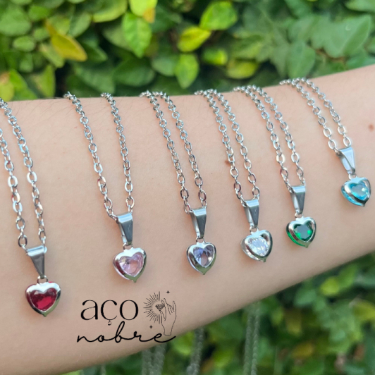 conjunto colar com brincos Aço Inox brinco pedra Zicórnia e coração gota e olho grego