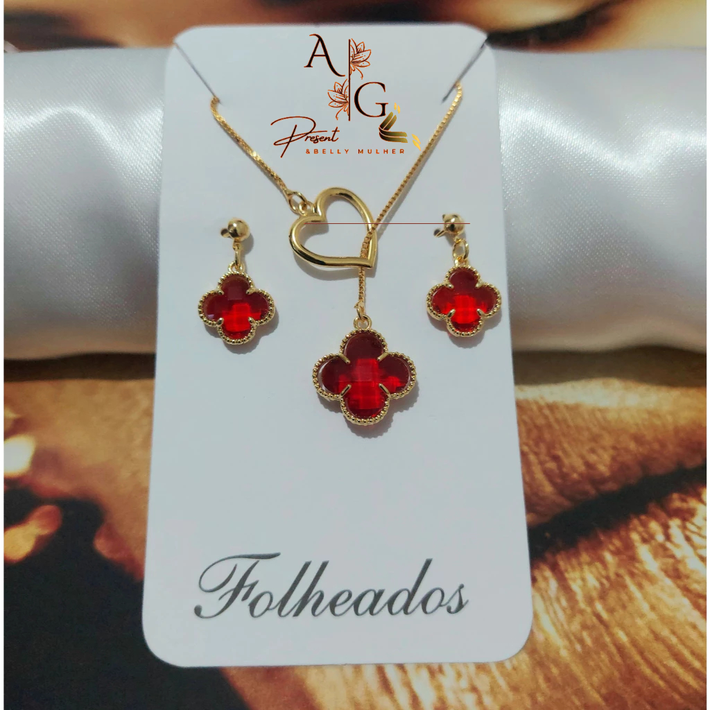 Conjunto Gravatinha Designer Flor com Pedra Cristal e Resinada Colar e Brincos Femininos Folheados a Prata925 e Ouro 18k