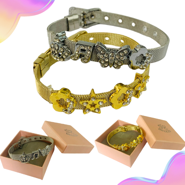 Pulseira de Aço Inox Unissex + 4 Berloques. (Chame no Chat para informar os berloques escolhidos)