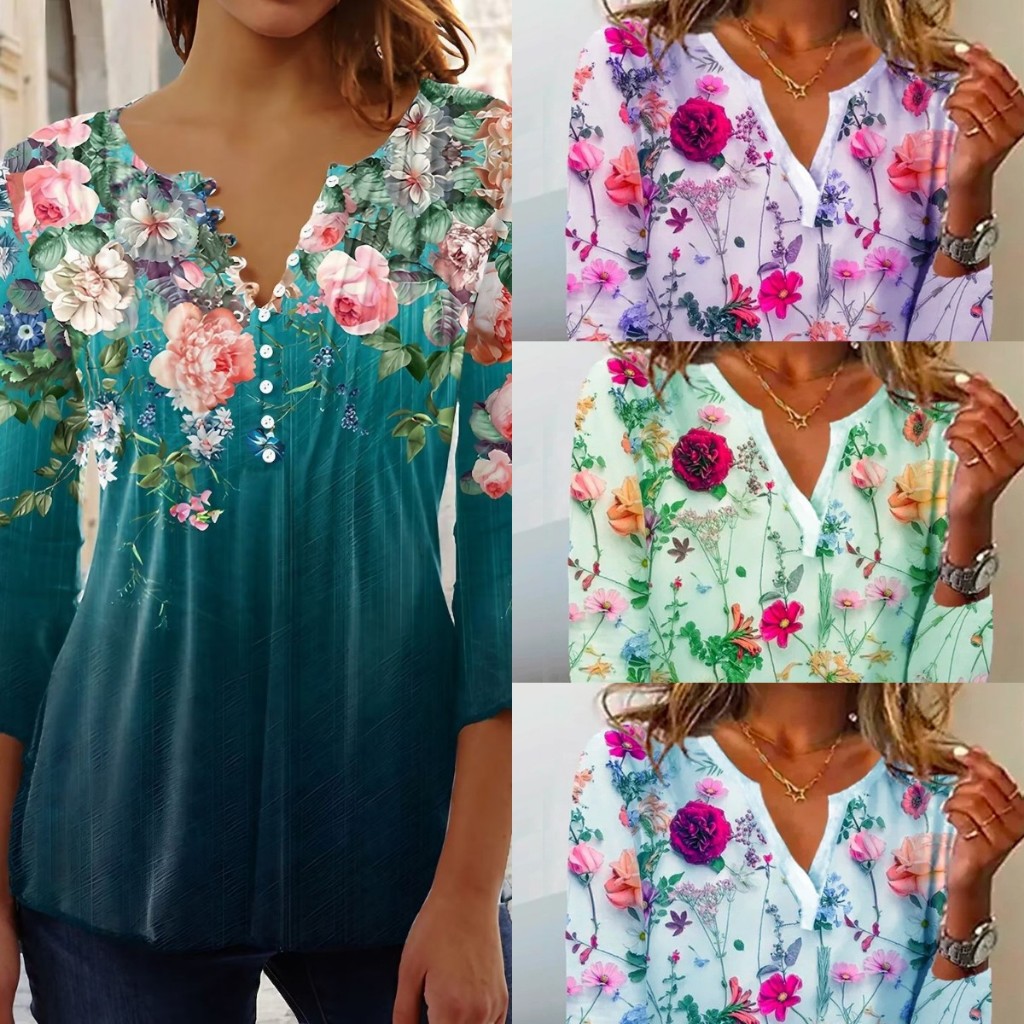 Camiseta Casual Feminina De Verão Com Decote Em V Camisetas De Pescoço Senhora Floral Tamanho Plus