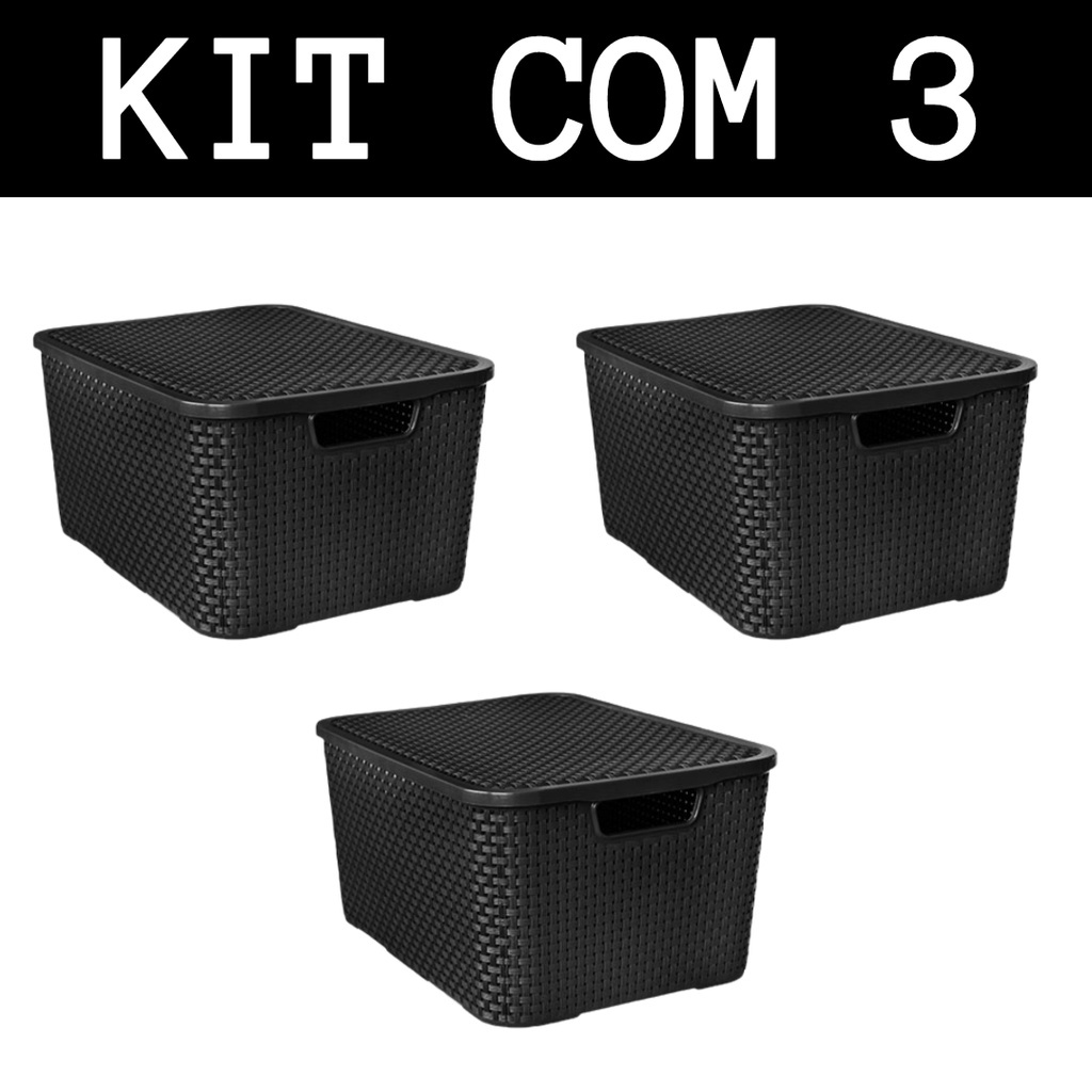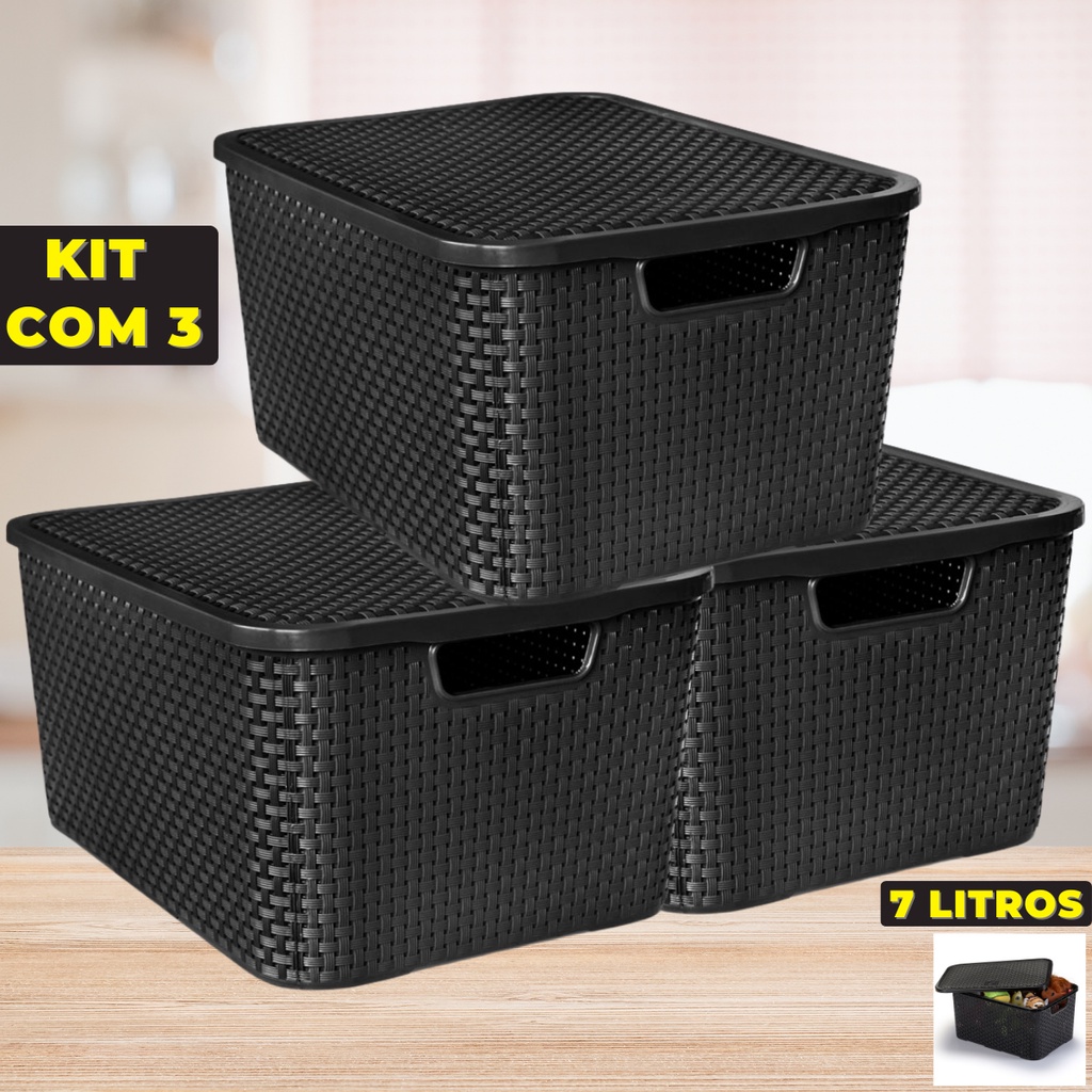 Kit Com 3 Cesto Caixa Organizadora Rattan Com Tampa 7 Litros Preto