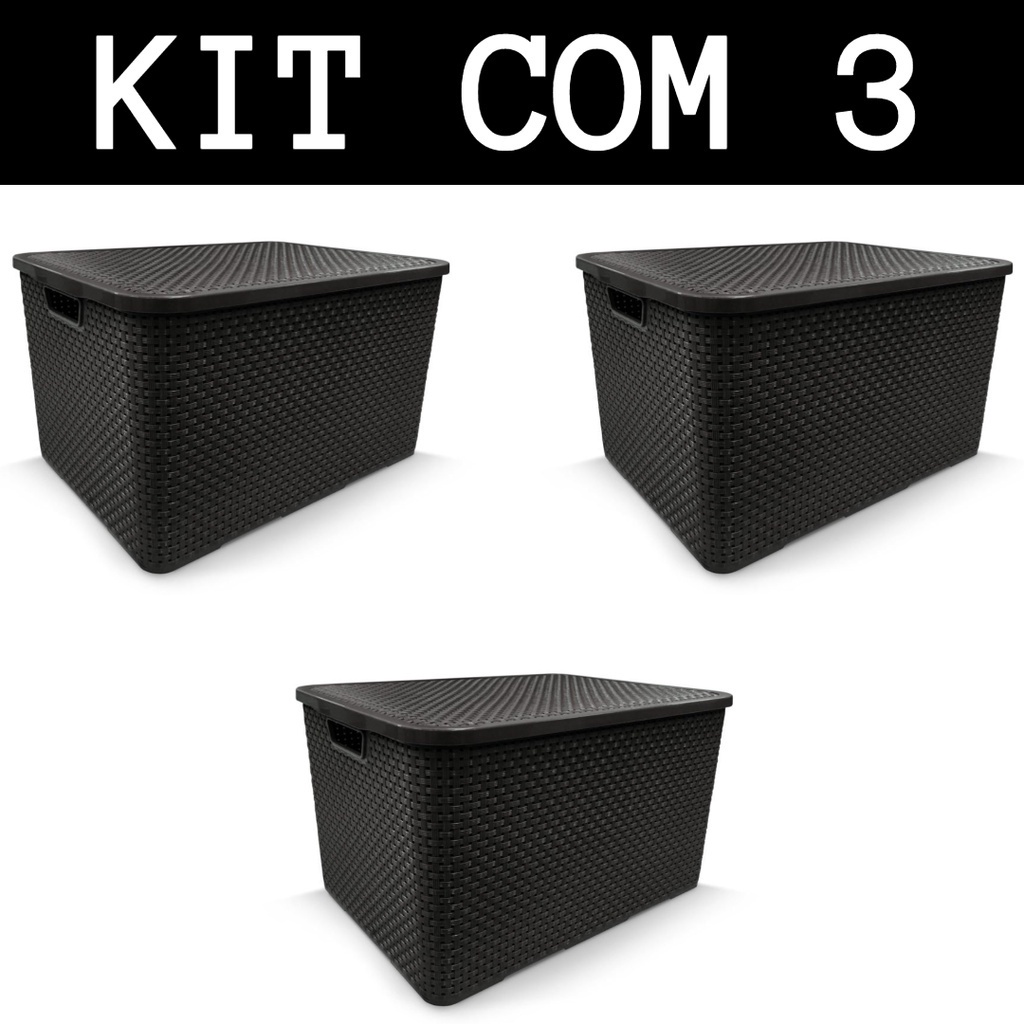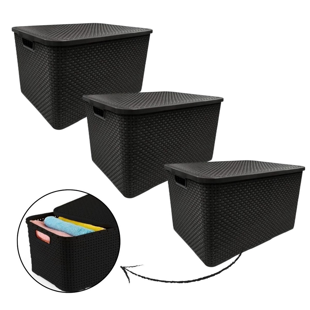 Kit 3 Caixas Organizadoras Cesto Multiuso Rattan 20 Litros Com Tampa Preto Empilhavel Brinquedos Roupas Livros Caixa Organizadora