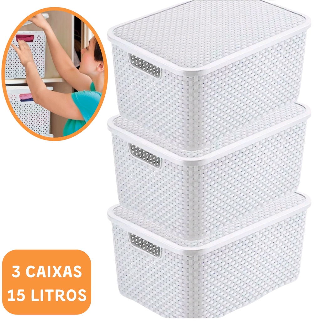 Kit Com 3 Caixa Com Tampa Organizadora Rattan 15 Litros Branca