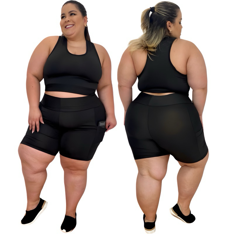 Conjunto Fitness Plus Size Short Ciclista com Bolso + Top 44 ao 54 Academia modelo Curves feminino