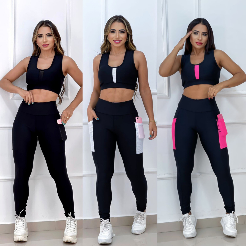Conjunto Fitness Top + Calça Legging Com Bolso em Suplex Cintura Alta - Moda Academia Feminina