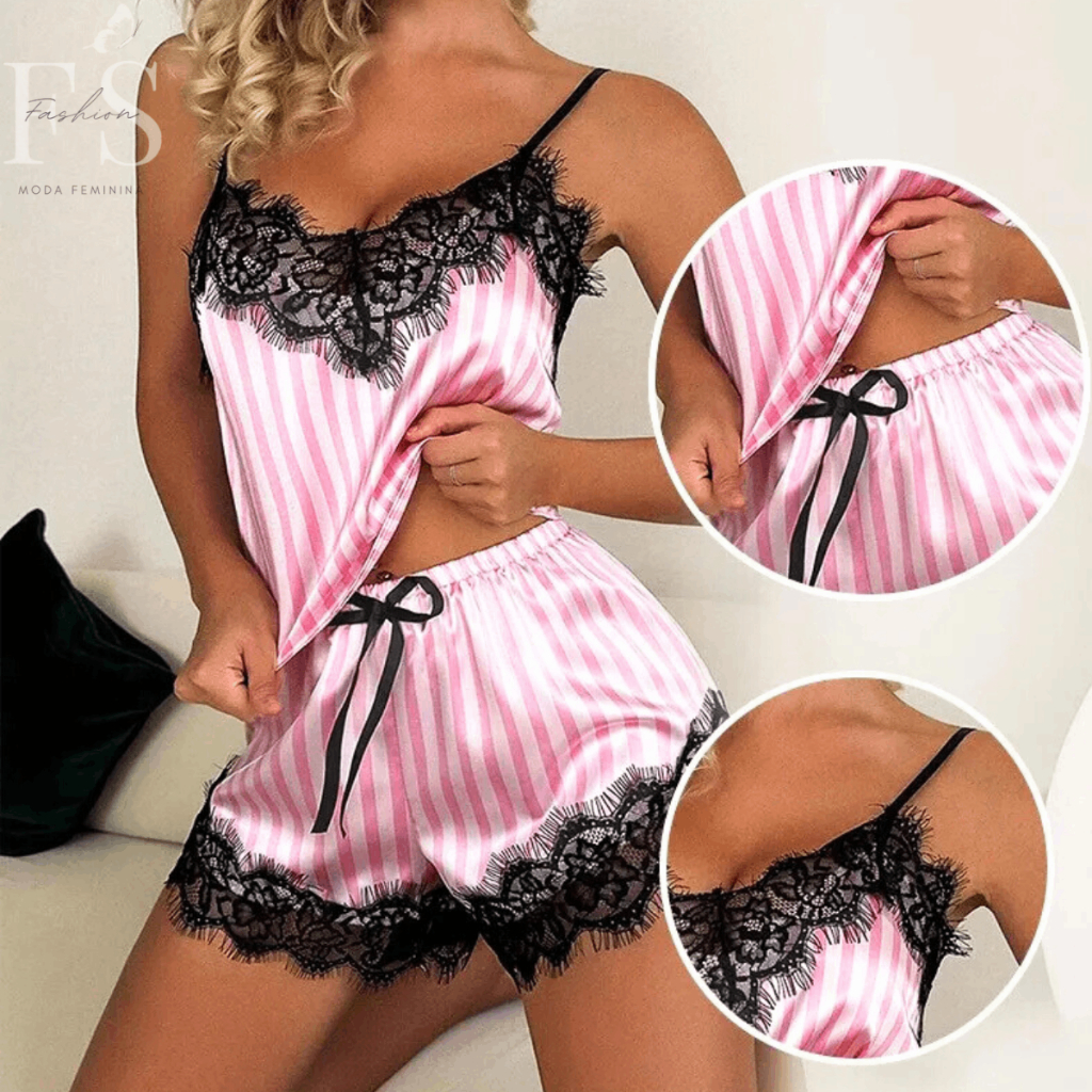 Pijama Feminino Mulher Baby Doll Rosa Pink Renda Inspiração Victoria Secret, Conjunto De Dormir Sexy Listrado e Curto