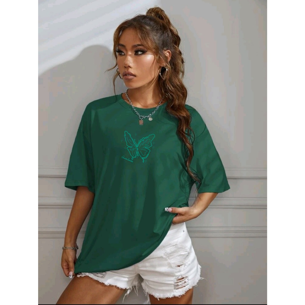 T-shirt Oversized feminina ombro caído ocasional 100% algodão com borbolets desenhado com letra estampada