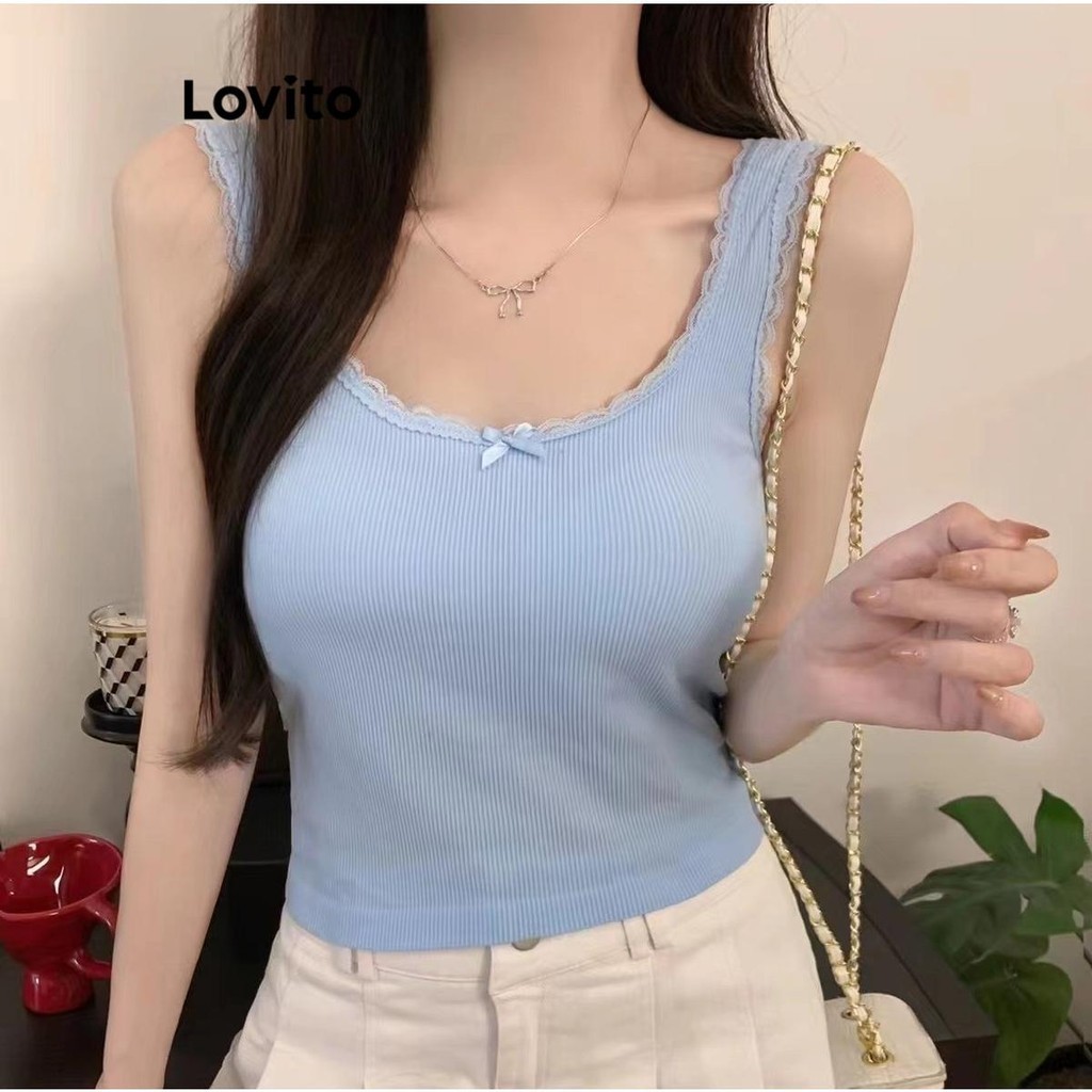 Lovito Regata e camiseta casual de renda lisa com laço frontal para mulheres LNE55235