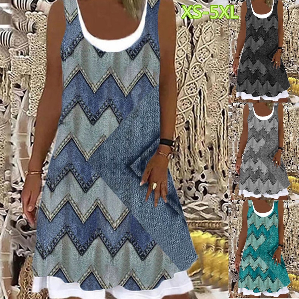 Vestido De Verão De Ganga Geométrico Feminino De Listras Geométricas Impressas Casuais Sem Mangas Pescoço Redondo Solto Plus