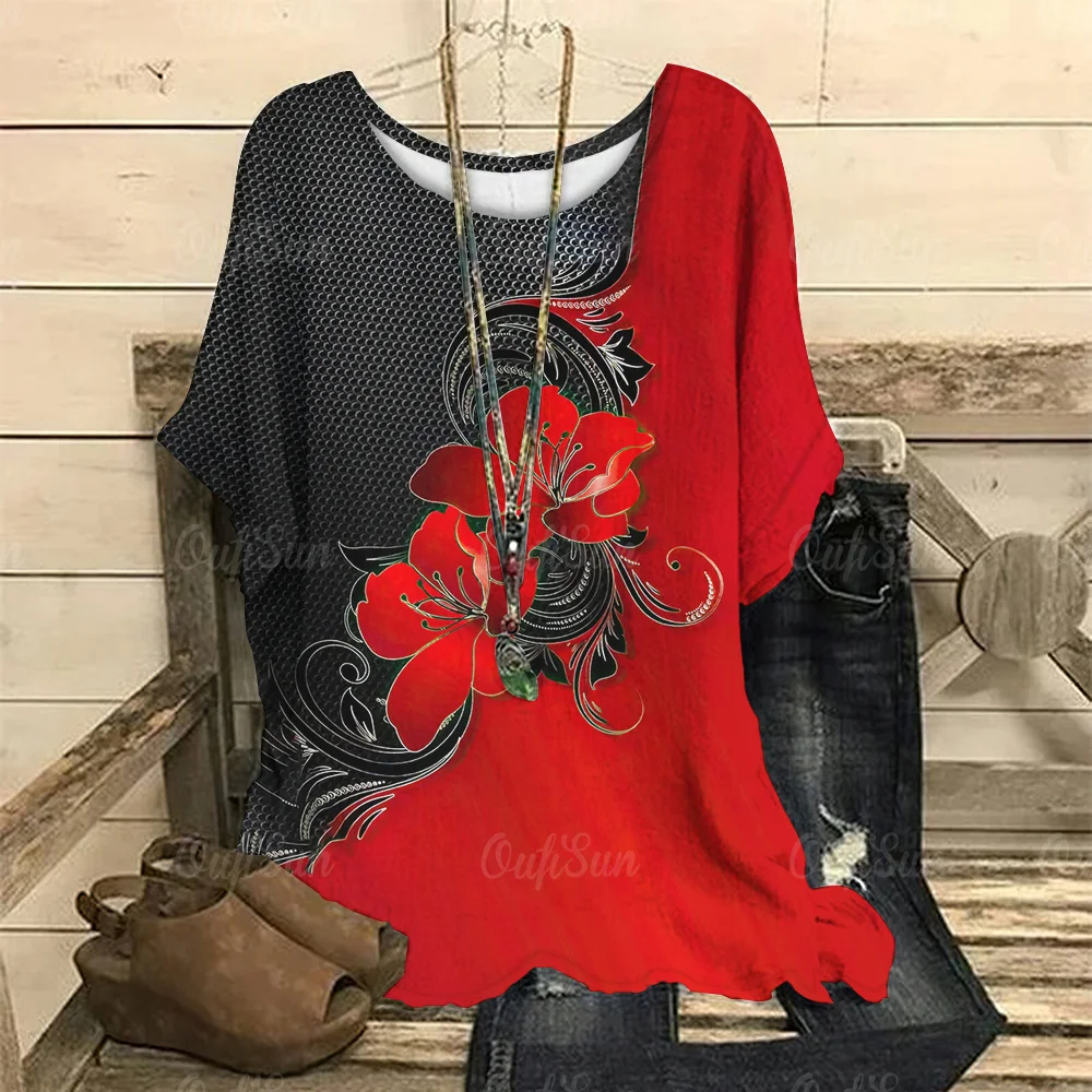 Camiseta O-Neck 2023 Outono E Inverno Manga Curta Solta Tops 3D Flores Padrão De Impressão Vestuário Casual Ladies Streetwear Elegante Pullover Tees
