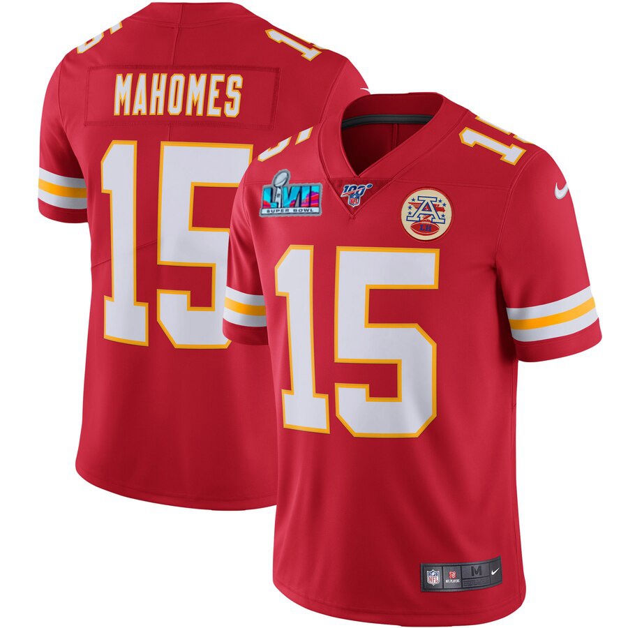 Masculino Camiseta 2023NFL Super Bowl LVII Patch Kansas City Chiefs Patrick Mahomes Vermelho Limitada Camisa de Futebol Americano Jersey