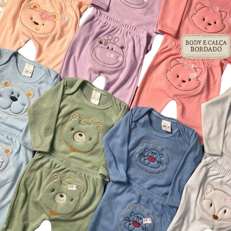 Kit 2 Peças Body e Mijão Bordado 100% Algodão Para Bebê Menino e Menina