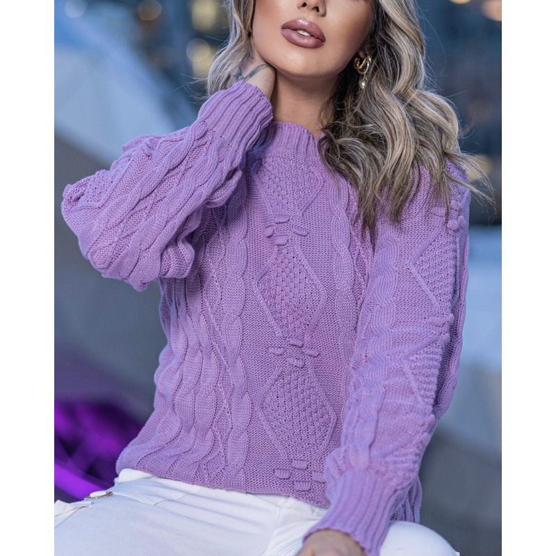 Blusa de Frio Feminina Tricot Manga Longa Com Tranças Bolinhas e Losango Inverno Trico Promoção Lançamento 2023