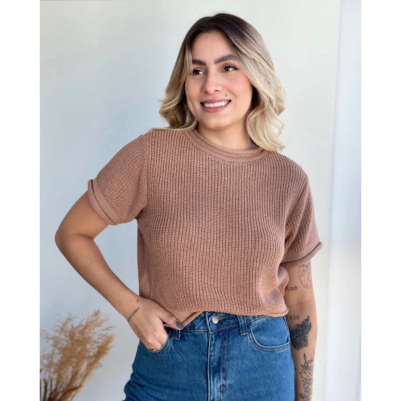 Blusa Cropped T-shirt Feminina de Tricot Com Manga Curta No Ponto Fang de Tricô Enroladinha Moda Blogueira Trico 2023