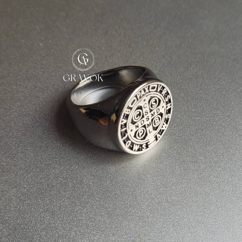 Anel Masculino De São Bento Dedeira Prata Medalha Aço Inoxidável 316L