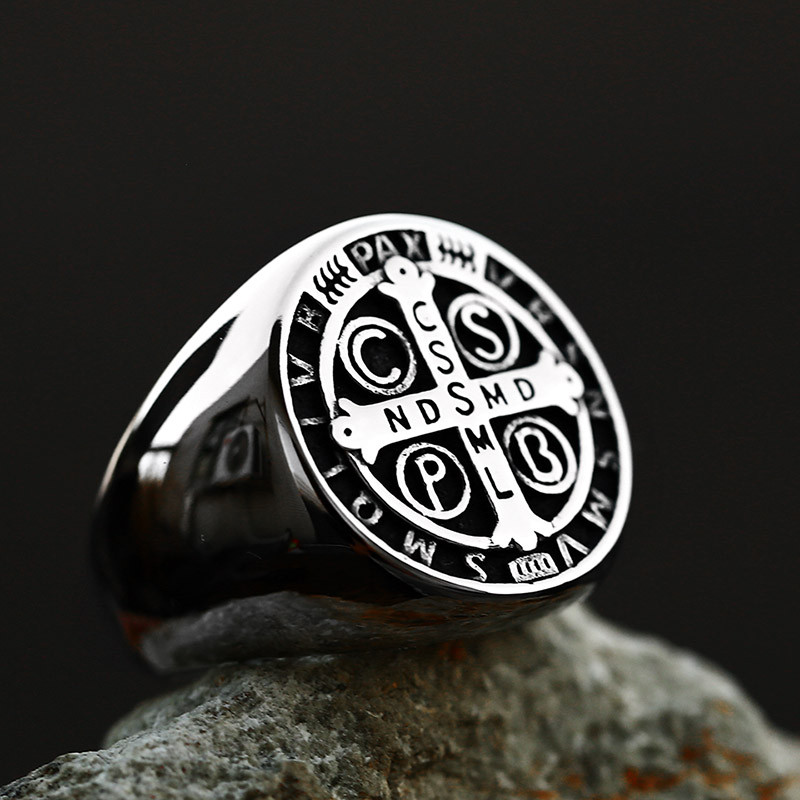 Anel Masculino De São Bento Prata Medalha Dedeira Religioso Motoqueiro Punk Aço Inoxidável 316L