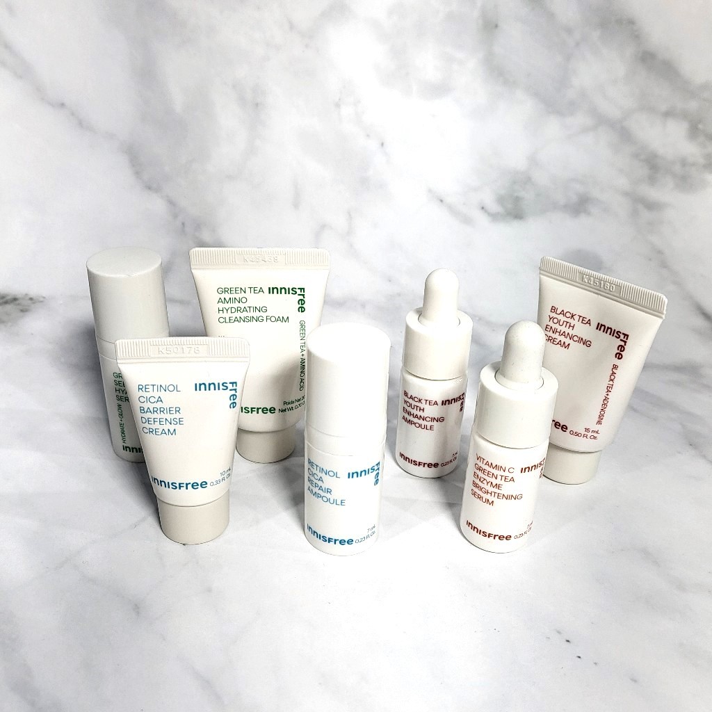 innisfree best mini size black tea, retinol, vita c cream, serum, form cleanser, green tea cream