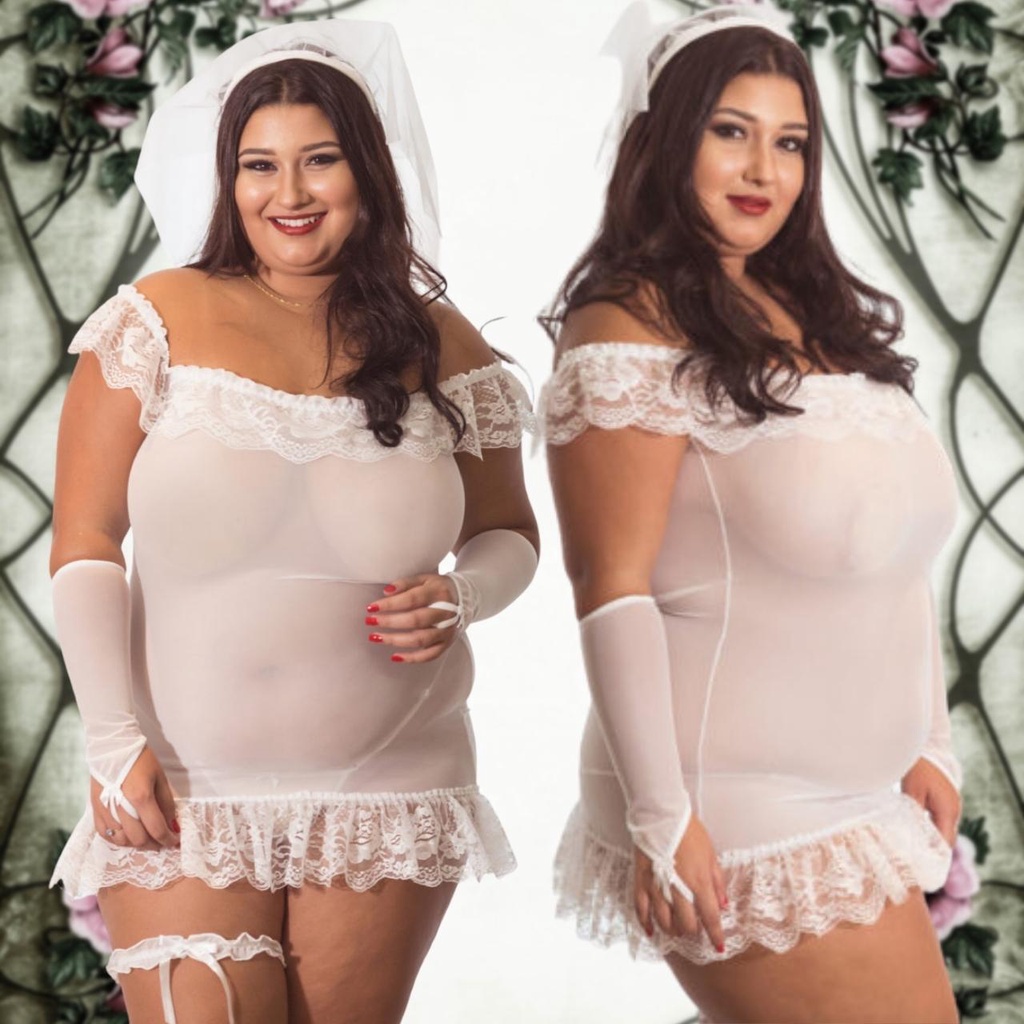 Fantasia Noiva Sedutora Plus Size Lingerie Sensual Noivinha Plus com Véu Luvas Perneira e Calcinha GG