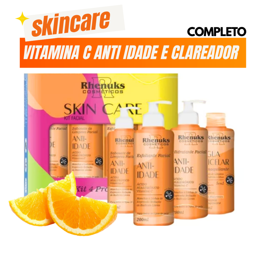 Kit Skincare Vitamina C Anti idade Clareador Limpeza Facial Rhenuks 4 Itens