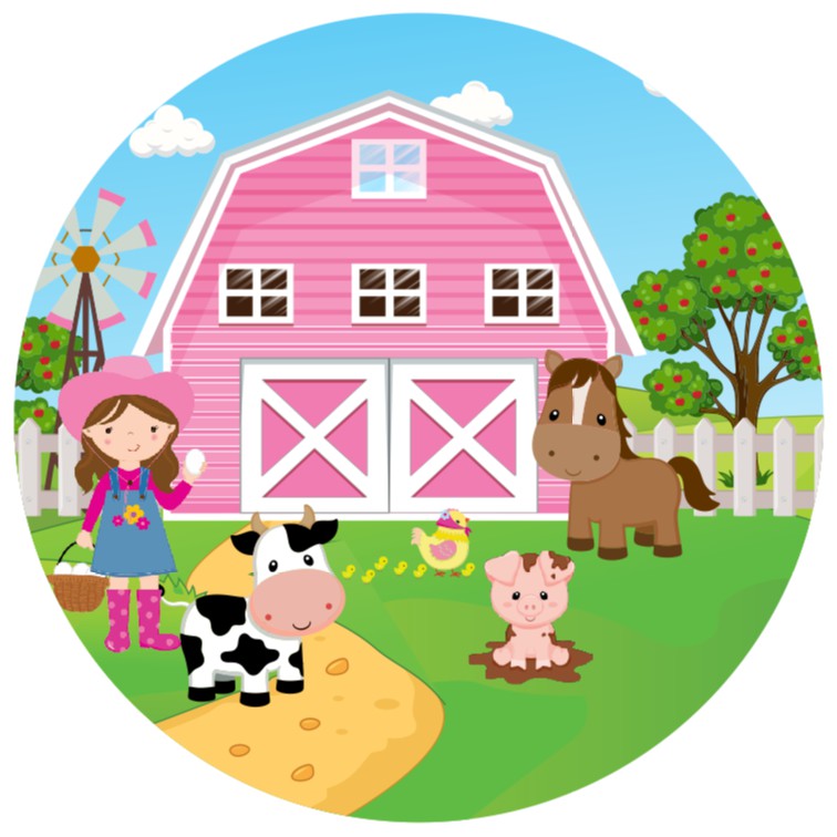 Painel redondo sublimado tecido tema fazendinha Rosa 1,50 m x 1,50 m com elástico Mod 02