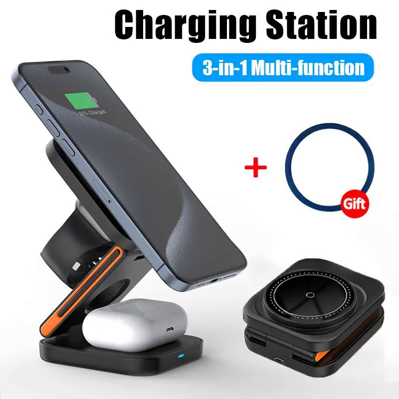 Suporte Magnético Sem Fio Para Carregador 3 Em 1 Estação De Carregamento Dobrável iPh 15 14 13 12 iWatch 8 7 6 5 Airpods Pro