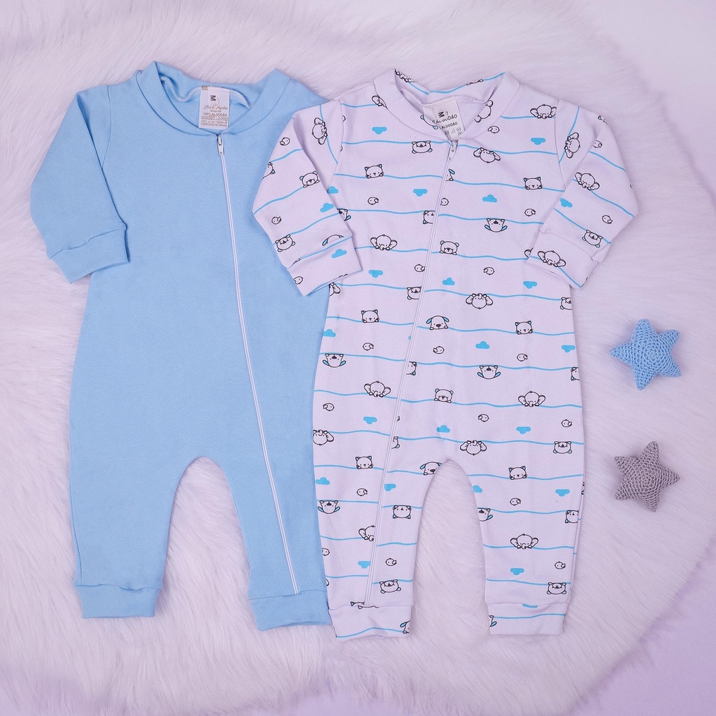 Combo Kit 02 Macacão Manga Longa Para Bebê Menina/Menino em Malha Canelada com Ziper - Tamanho RN, P, M e G