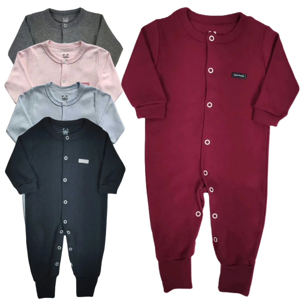 Kit 3 macacão longo bebê liso com botão e pé reversível 3 unidades sortidos 100% algodão macio