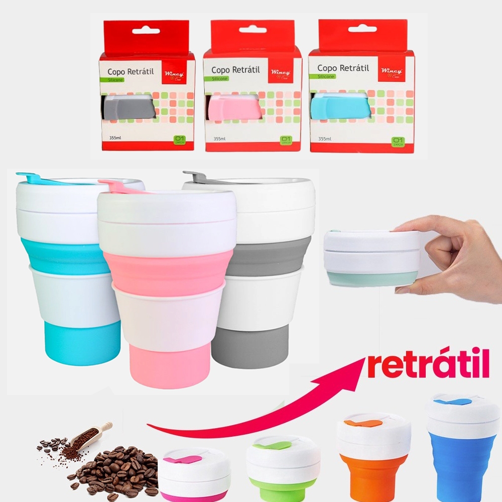 Copo Silicone Retrátil Dobrável C/ Tampa Reutilizável 350ml Colorido Ecológico Pronta Entrega