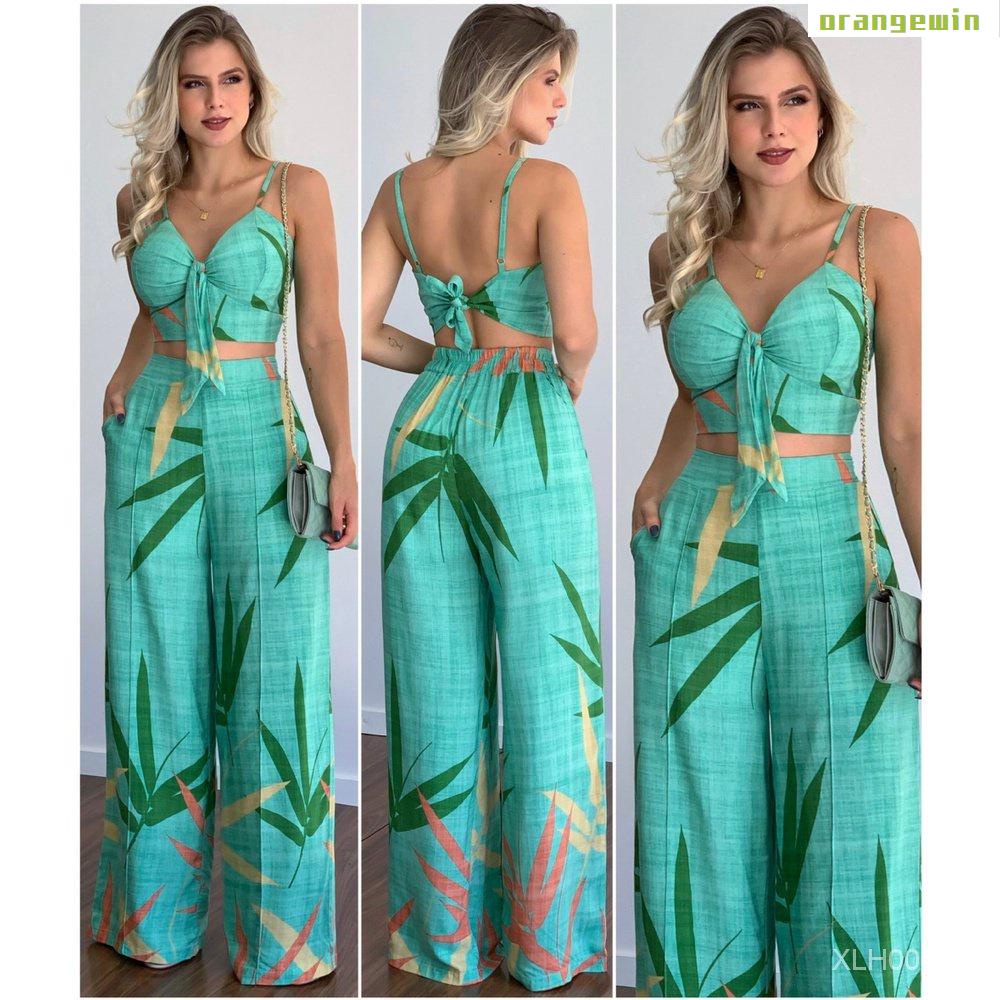 Conjunto Feminino De Duas Peças Com Calça E Camiseta De Gola V De Cintura Alta Estampada