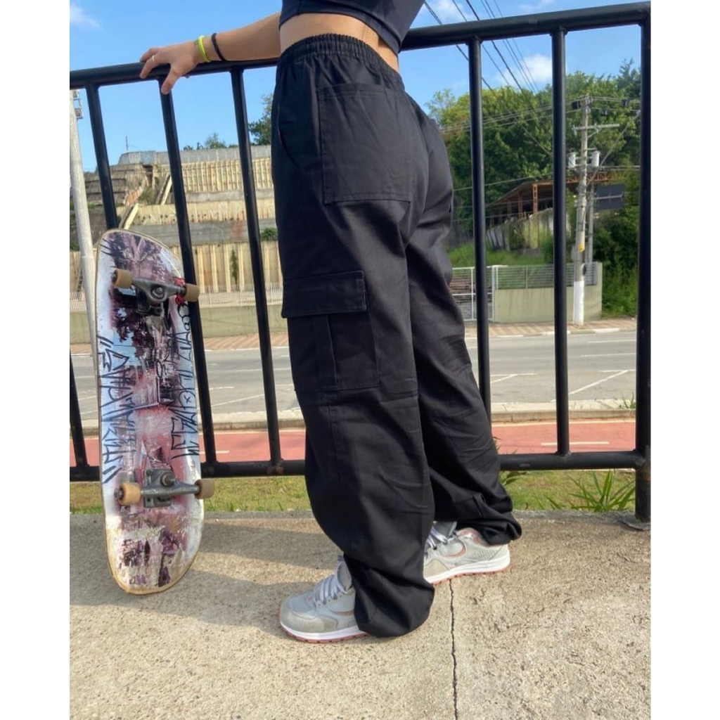 Calça Cargo Larga Masculina Feminina Skate Preta 5 Bolsos Fechamento Cordão Unissex