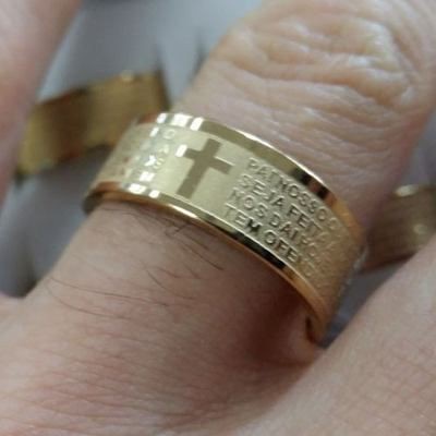 Anel Aliança Oração Pai Nosso Português Cruz Masculino Feminino Unissex Aço Inox 316L Inoxidável Dourado Religioso