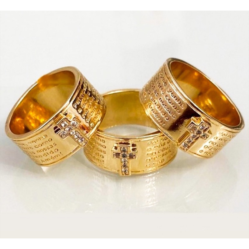 anel cristão cruz unissex dourado com oração pai nosso gravado.