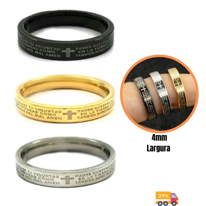 Anel aço inoxidável Pai Nosso aliança inox 4 mm largura feminino masculino aneu aço 316L prata dourado preto oração religioso cruz fino