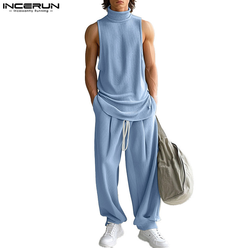 INCERUN Homens Vintage Casual Fatos De Duas Peças De Gola Rulê Listrada
