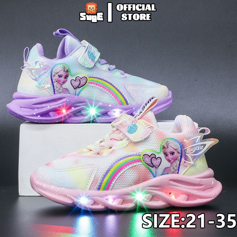 【Suge】Tênis Esportivo Infantil Feminino Com Claro LED/Frozen/Elsa/Sola Flexível/Respirável/Antiderrapante/Casual Para Meninas 025