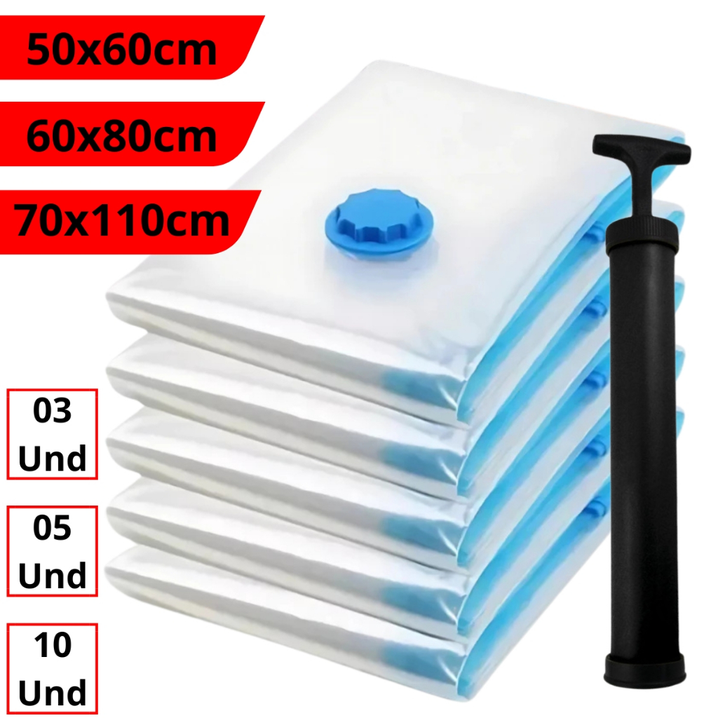 Kit Saco a Vacuo + Bomba Manual Organização de Roupas Mala Viagem Guarda Roupas