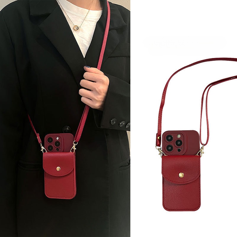 Estojo Protetor Para IPhone Vermelho Borgonha Temperamento 15pro Com Porta-Cartões E Cordão De Corpo Cruzado Apple 14 13/15pro