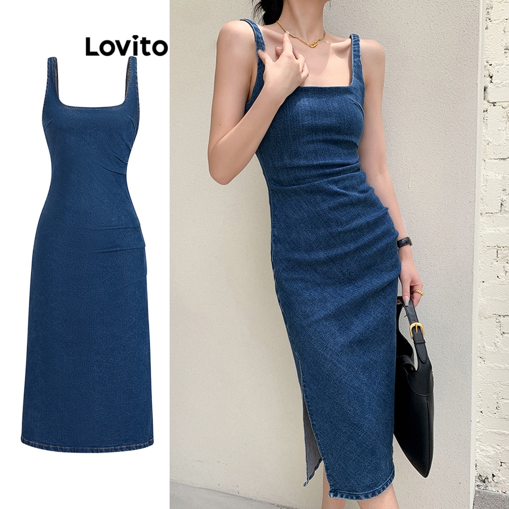 Lovito Casual Liso Vestido Jeans Feminino Franzido com Fenda L62ED104 (Azul)