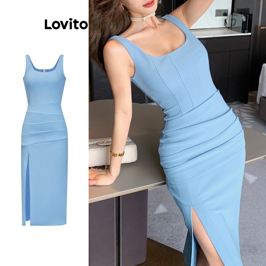 Lovito Casual Vestido Feminino Liso com Fenda Frontal L70AD102 (Azul)