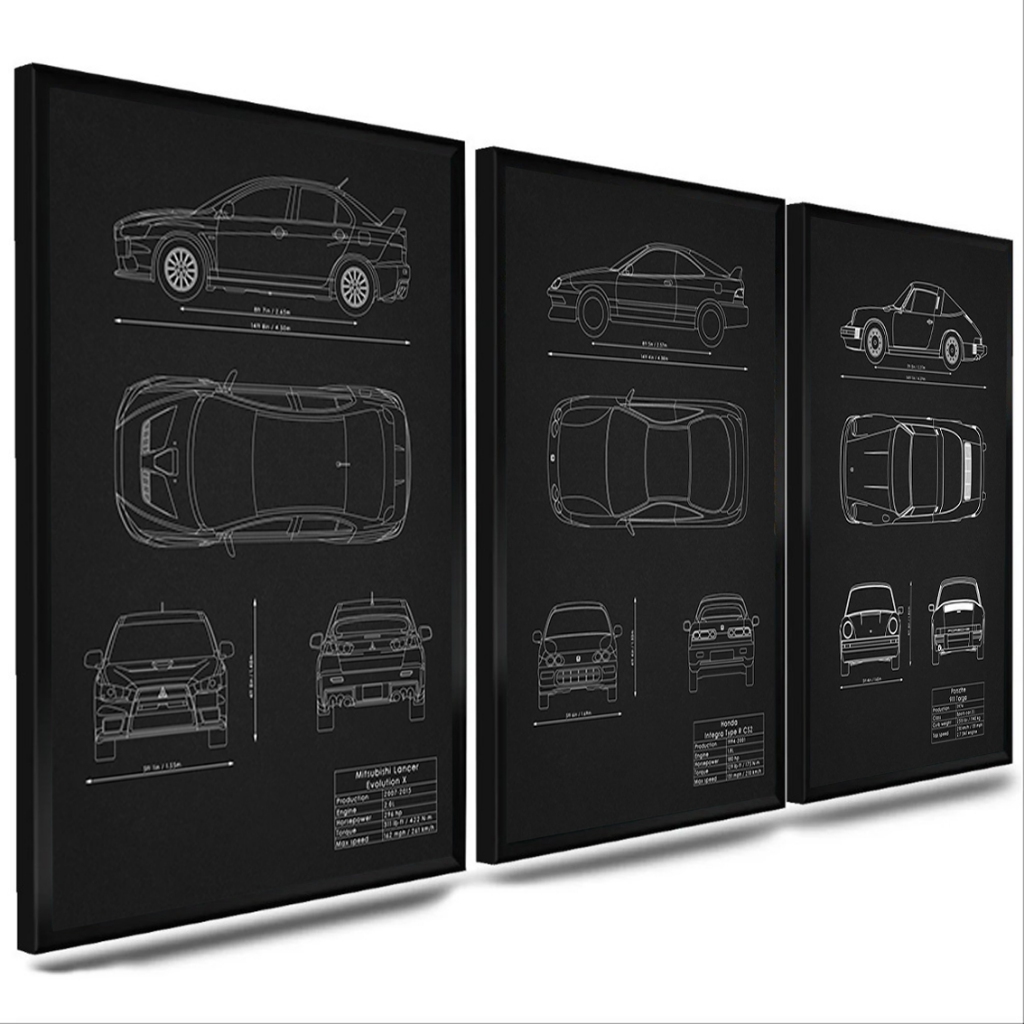 kit com 3 quadro decorativo moldura emoldurado - carros famosos Mitsubishi Lancer Mazda Porche sala e quarto com vidro