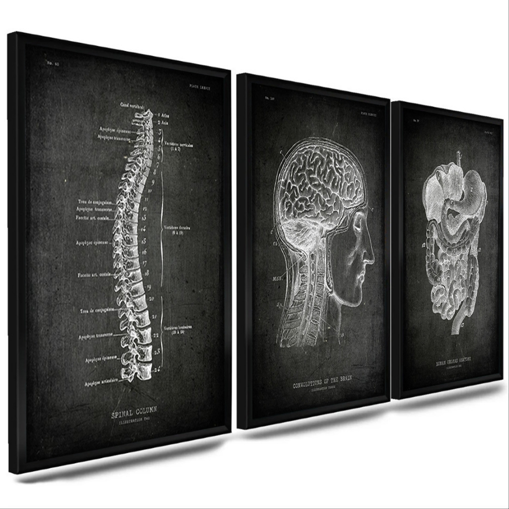 kit com 3 quadro decorativo moldura emoldurado - Anatomia humana esqueleto cerebro corpo sala e quarto com vidro