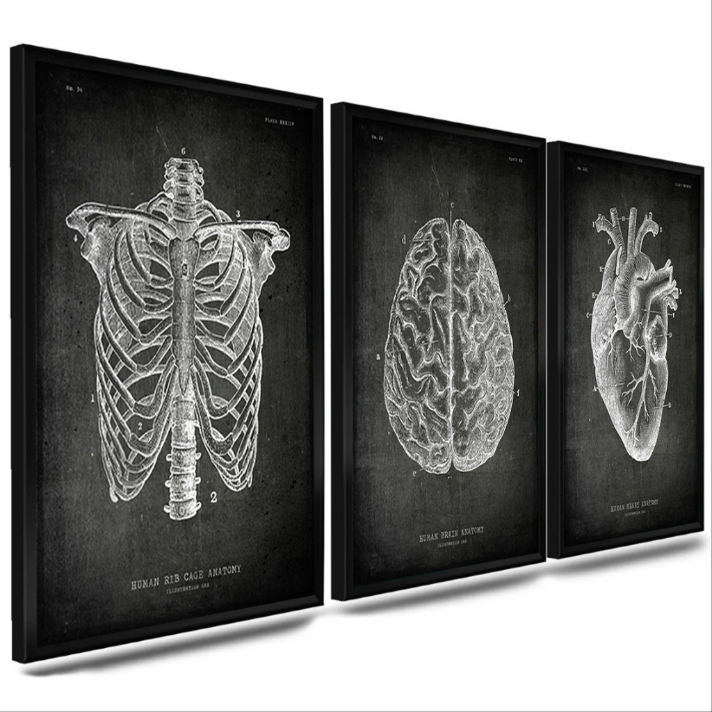 kit com 3 quadro decorativo moldura emoldurado - Anatomia humana torax coraçao arte desenho sala e quarto com vidro